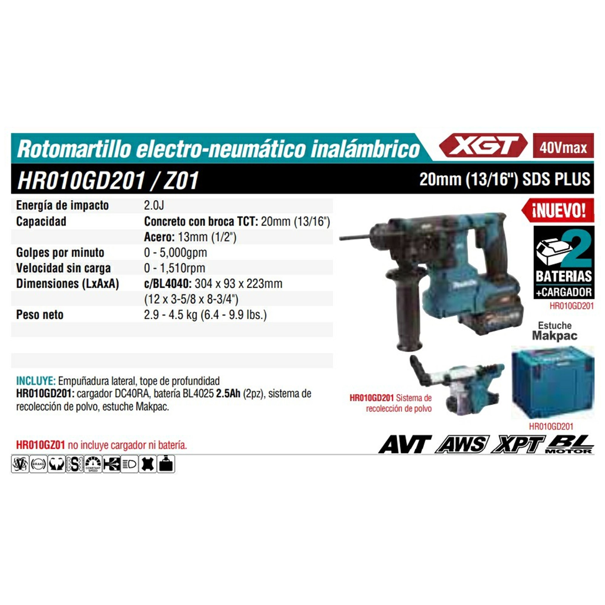 HR010GZ MARTILLO ROTAT.COMB. (BLUETOOTH) SDS PLUS 13/16″ V.V.R. 0-5000 GPM M/BL LI.ION S/BAT Y CARG C/FRENO LUZ 40V