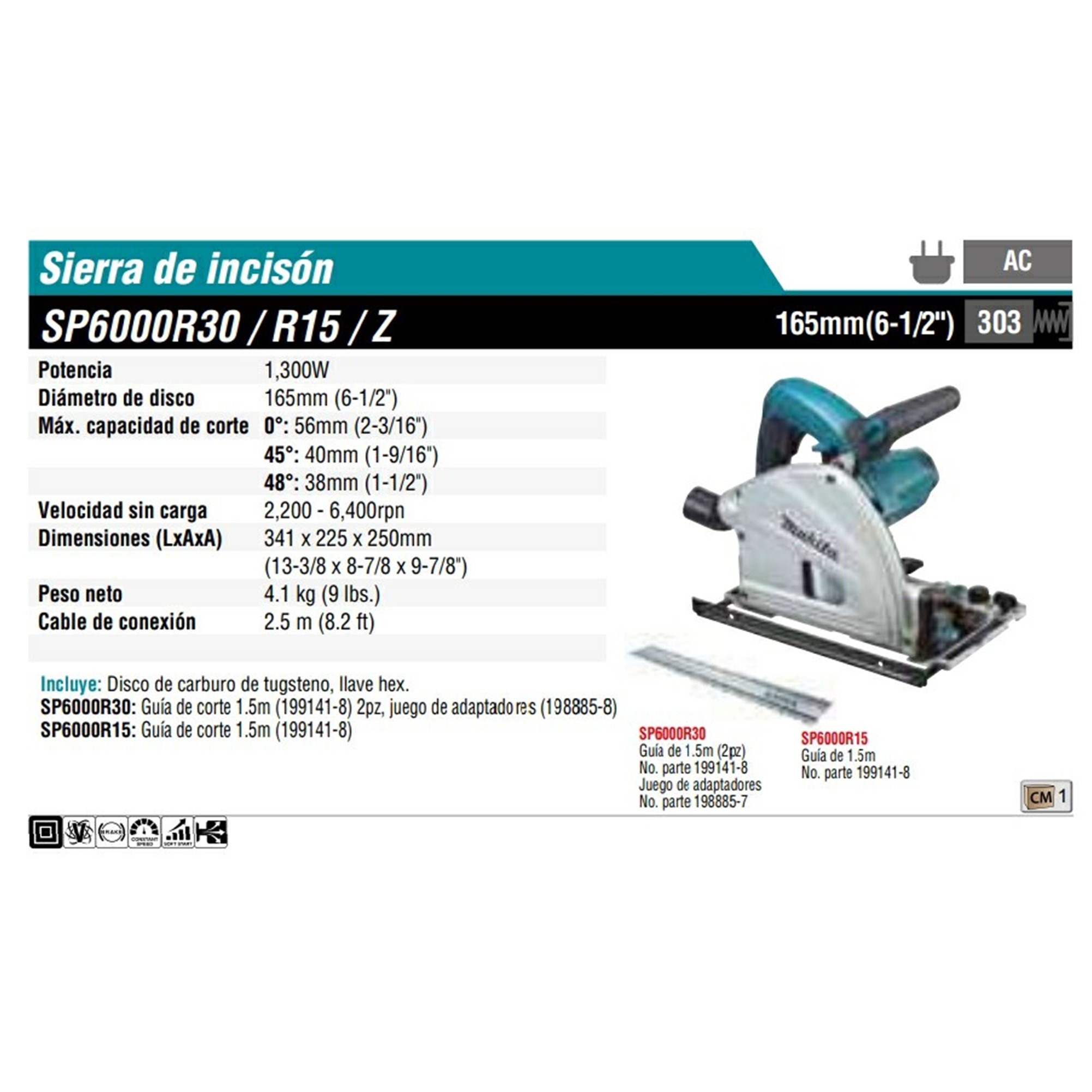 SP6000 SIERRA CIRCULAR 165MM 6 1/2″V.V.C.2,000-5,800 RPM SIN GUÍA C/FRENO, 1,300W