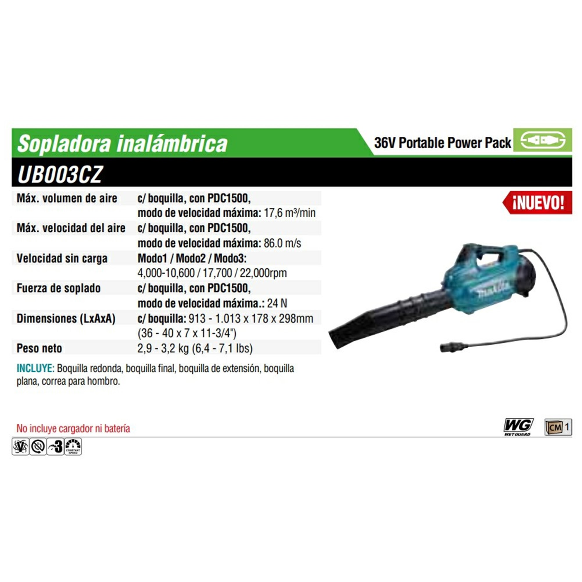 UB003CZ SOPLADORA 3 VEL. 10600-17700-22100 RPM M/BL LI-ION S/BAT Y CARG, (USO EXCLUSIVO BATERY PACK) 18V + 18V 36V