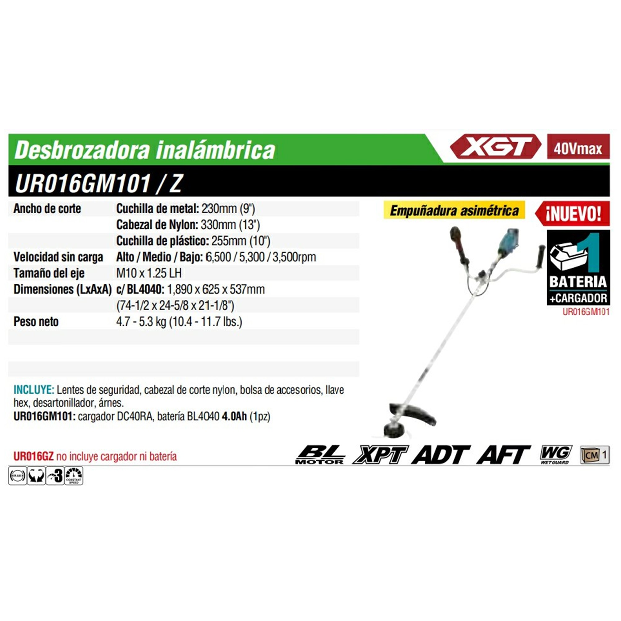 UR016GZ DESBROZADORA INALAMBRICA 3 VEL. V.V.R. 0-6,500 RPM M/BL LI-ION S/BAT Y CARG,MANGO “U” C/FRENO 40V
