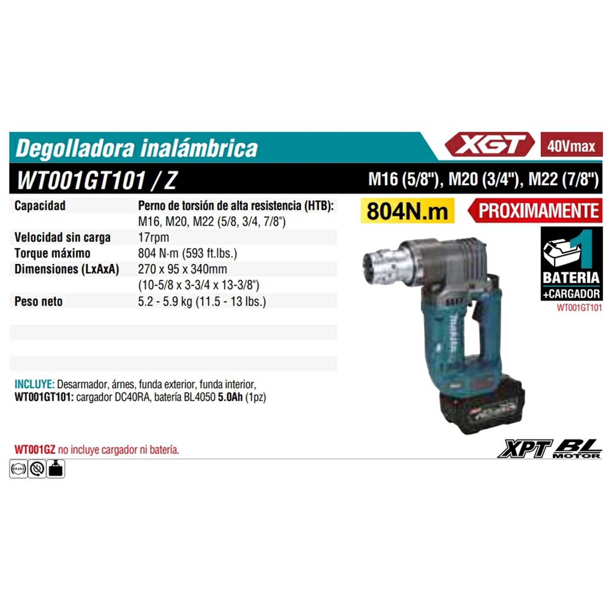 WT001GT101 DEGOLLADORA DADO MM20, M22, M/BL LI-ION C/1 BAT 5.0 A.H Y CARG C/ FRENO MALETIN 40V